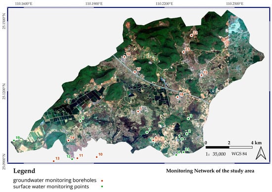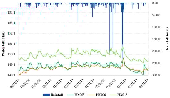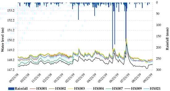Among the identified stations, borehole numbers 5#, 6#, 8#, 10#, 11#, 13#, 14#, 15#, 16#, 17#, 18#, 22#, and 23# were the locations of groundwater monitoring, while 1#, 2#, 3#, 4#, 7#, 9#, 12#, 19#, and 21# were for surface water, as shown in Figure 3. Most of the surface water stations are within the wetland except 19#, which is located at the confluence of the Mudong River and the Xiangsi River in the far west. Based on the analysis of the surface water monitoring data, the water level in the area responded fast to intensive precipitation and fluctuated with rainfall almost instantly, having a great correlation with rainfall. The change in surface water level was affected directly by atmospheric precipitation (Figure 4).