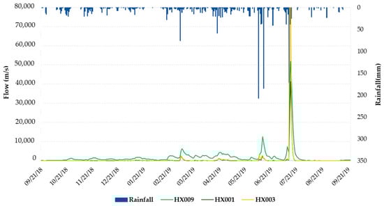 Surface water flow in the area showed a perfect corresponding relationship with rainfall events. Arrivals of peak water levels were often delayed by 1–3 days, depending upon rainfall intensities (Figure 5). It was found that if the cumulative rainfall exceeded 90 mm per day, the arrival time of a peak level would be within the same day, which implies that the rapid flow was most likely facilitated by the karst pipe flow upstream.