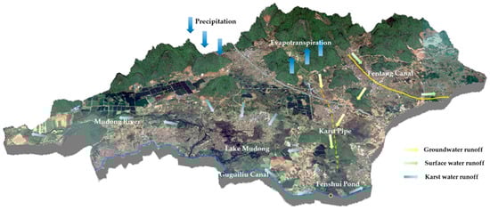 A water balance method is commonly used to understand the components that constitute a catchment system [33,34,35,36]. This approach was used for the verification of each component, which was identified based on the field investigation within the whole study area, to predefine the water circulation paths, which could pave the way for the following analyses. The area belongs to a fairly enclosed ecohydrological system. However, this region is located in a watershed area, and it is especially required to determine water circulation routes at a regional scale using a water balance checkup (Figure 2). According to the hydrogeological conditions, Lake Mudong, Fenshui Pond, and Guguiliu Canal, which are referred to as the Lake Mudong drainage zone, were the focal points of the area. Therefore, the water balance analysis was taken for the drainage zone at a macro scale, and each of the water balance components within the zone was independently determined to assess if they could be balanced out within the zone. The balance was used to confirm whether the stored water would leak vertically or not, namely whether or not precipitation minus evapotranspiration equals water flux (karst water runoff) within the scope of the area.