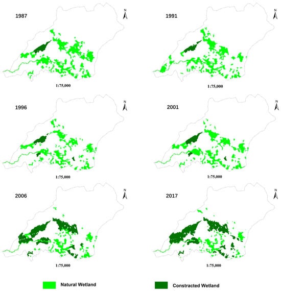 The results of the wetland and constructed wetland from RS image interpretation during the period from 1987 to 2017.