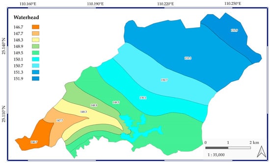 To simulate the dynamic conditions of the area, including the groundwater flow field, fluctuation range of the water level, and the change situation under different water supplies, three regions were recognized and divided, and different parameters were assigned for different zones as indicated in Figure 11. The mountains of the area are mainly recharge regions; the cultivated areas in the middle of the area are mainly runoff regions; and the water bodies are mainly drainage regions. There are 8 stations in the groundwater monitoring network in the area that have complete data, i.e., 5#, 6#, 9#, 14#, 15#, 16#, 18#, and 22# as indicated in Figure 3. The monitoring data were used as calibration points during the model simulation. Among them, 6 of 8 points are in the confidence interval, for which fitting differences are less than 0.5–1 m. Both the water level and the water volume were incorporated into a unified hydrological unit, and the initial relationship between the water level and the water volume is established. The resultant flow field of groundwater was consistent with the multi-year average observation, as indicated in Figure 12.