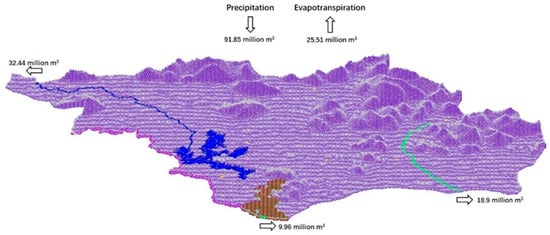 In the water balance analysis, the independently assessed components in the area were summarized as follows: the precipitation of 91.85 million m3 (P) and the combined volume from both evapotranspiration and runoff of 86.81 million m3 (E + R). The difference between P and E + R was 5.04%, a marginal error, as indicated in Figure 13.