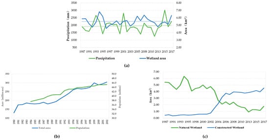 Results from 1987 to 2017 showed no particular trend of precipitation, and the wetlands were observed in general, as indicated in Figure 14a. However, variations in wetland sizes had been synchronized with rainfall fluctuations until 1999. It can be seen from Figure 14b,c that the local population and the freshwater aquaculture in Lingui Town grew steadily. The local government launched stimulus policies for structural readjustment of the rural industry during the late 1990s. Freshwater aquaculture had increased sharply within a short space of time, while the area of the wetland concomitantly shrank significantly.