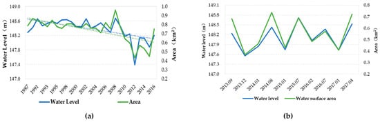 The relationship between water level and area of Lake Mudong; (a) the changing trend during the period from 1987 to 2017; (b) the seasonal variation situation in many years.