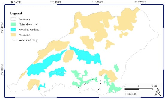 In addition to the above information obtained from RS, three aspects were considered, namely the precipitation data obtained from the Guilin hydrometric station, the population expansion from the Statistical Yearbook of Guangxi Zhuang Autonomous Region, and the local stimulus policies launched by the government. Spatial analysis of GIS was required for the identification, comparison, and analysis of the hydraulic dynamics of Lake Mudong, the wetland, and the constructed wetland over the past 30 years. The following points were noted: