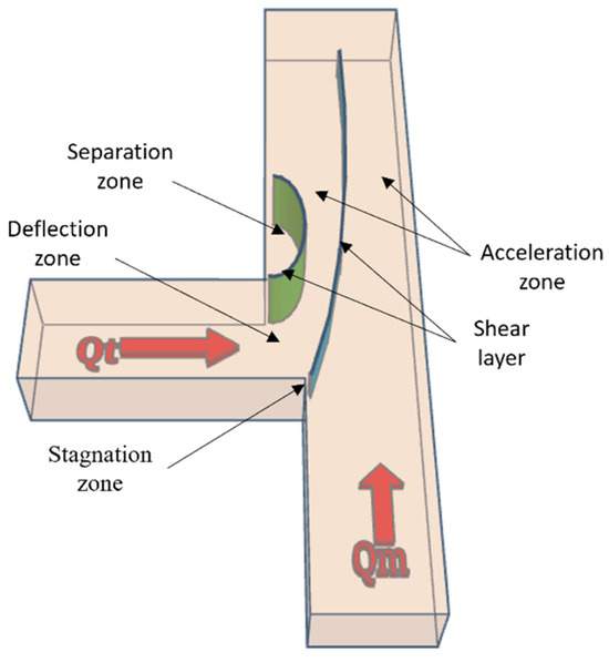 A schematic of the junction presenting different flow zones (Qt and Qm being the discharges of the upstream tributary and main channel, respectively).