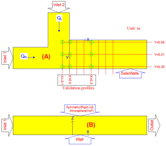 Measured sections, validation profiles for the simulation area, and boundary conditions of the Flume: (A) plan view (B) side view. Qt is the discharge of tributary channel, while Qm is the discharge of the main channel. Green circles mark the profiles that are used to compare the modeled and measured data (see more details in Section 3.1).