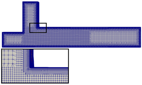 In this study, snappyHexMesh was used to generate the mesh, which is shown in Figure 3. The size of the numerical domain is the same as the physical field of the experiment [33]. The grid size gradually increases from each boundary since a smooth grid transition is essential to make the numerical calculation stable (Figure 3).