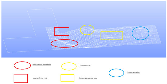Contour map of equilibrium bed morphology in Salome platform. The red solid circle, red dashed circle, red solid rectangle, cyan solid circle, and cyan dashed circle indicate the mid-channel scour hole, downstream scour hole, corner scour hole, upstream bar, and downstream bar, respectively.