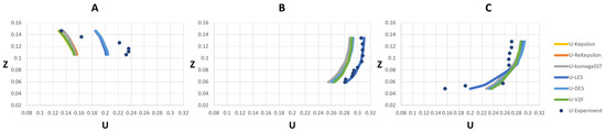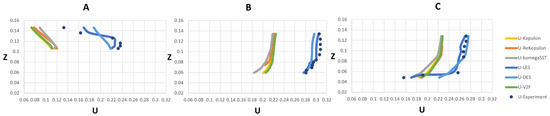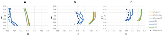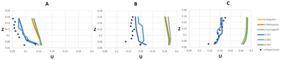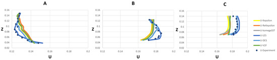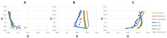 The meshes used in this study were specified based on the mesh sensitivity and independency analysis and used for the validation described in Section 3. Mesh sensitivity analysis was performed to choose the optimum mesh size, by finding the coarsest mesh size for which velocity results did not differ for a finer mesh (Table 3). The developed model was thus run with three cell numbers of 801,254, 1,004,209 and 1,205,052 for RANS models. It was found that velocity results did not change substantially (around 0.04%) between the 1,004,209 and 1,205,052 meshes; thus, the 1,004,209 mesh was selected for the RANS group. Also, 6,376,502 was chosen for the LES group based on verification of TKE.