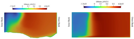 Le et al. (2019) [25] employed LES to inspect the hydrodynamics of a natural confluence zone in the Mississippi River. Data from remote sensing (light detection and ranging; LiDAR) and field measurements were used to construct the digital elevation model. The LES results were used to gain more insight on the river flow dynamics and to illustrate the long-range impacts of hydraulic structures on the downstream flow. This study demonstrated the feasibility of high-resolution LES for large-scale rivers by considering the detailed bathymetry and submerged hydraulic structures.