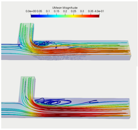 Duguay et al. (2022) [29] used an LES model in OpenFOAM and resolved three categories of large-scale turbulent structures, namely (1) vertically oriented (Kelvin–Helmholtz) vortices; (2) secondary flow helical cells, and (3) smaller, strongly coherent streamwise-oriented vortices. Intricate interactions among divided flow over the scour hole’s avalanche face, upwelling tributary flow, as well as downwelling main channel flow were the main causes for the mixing at this asymmetric mesoscale fluvial confluence. To create a stronger mixing, both vertically oriented and streamwise-oriented vortices were firmly coupled. It is worthy to note that similar interactions were predicted via collective analysis of instant eddy-resolved modelling and aerial studies of turbulent mixing of natural turbidity gradients within the mixing interface.