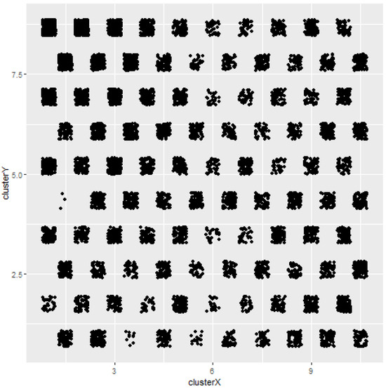 SOM, a type of artificial neural network, is a clustering technique that groups similar data with spatial characteristics, performing both dimensionality reduction and clustering. SOM is a neural network algorithm that can compress complex relationships between high-dimensional data into a two-dimensional array by comparing the Euclidean distances between input data [23,24]. To set the grid size, Tian et al. used [25]. However, when there is a large amount of research data, setting too large of a grid size can lead to long computation times, which is a drawback. In this study, as it is important to have high clustering accuracy for prediction based on precipitation type, the grid size was selected using the representative F1 score metric (Figure 2). In this research, the grid size of SOM was set to 10 × 10 (Figure 3).