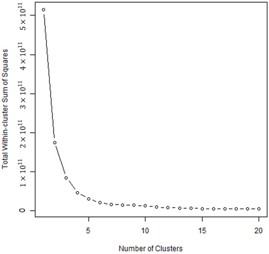 K-means clustering is the most commonly used method for clustering. It provides more accurate clustering results than SOMs [27]. Determining the number of clusters is essential for k-means clustering. The elbow method is one of the most prominent methods for determining the number of clusters. This method typically involves examining the within-cluster sum-of-squares (WSSs) based on the number of clusters to determine the appropriate number (Figure 4). In this study, the “kmeans” function in the “stats” package in R was utilized [27], and comparisons were made with three and four cluster numbers.