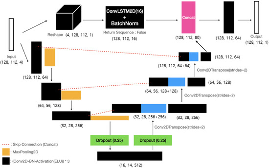 This study constructed a model to predict precipitation by incorporating a Conv-LSTM layer based on the U-Net architecture [16]. Here, the U-Net consists of a contracting path network to obtain the overall feature information of the image and an expanding path network for precise localization, forming a U-shaped symmetric structure. The Conv-LSTM model configuration includes using Conv2DTranspose layers with trained filters to increase the resolution through convolution operations. In addition, SpatialDropout2D was used to exclude all 2D feature maps. Specifically, a linear bottleneck structure is used to reduce the number of parameters. The bottleneck structure involves dimension reduction with a 1 × 1 convolution, followed by dimension expansion with a 3 × 3 convolution, and then using another 1 × 1 convolution to deepen the dimension, thereby effectively reducing the computational load. In this study, the input shape of the ConvLSTM2D U-Net models proposed by [16] was modified to (128, 112, 4) (Figure 6).