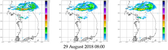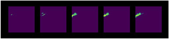 In this study, radar precipitation data were utilized and synthesized from two-dimensional gridded precipitation data obtained from the S-band radar network operated by the Ministry of Environment. The Ministry of Environment oversees the operation of several radar installations, including Biseulsan mountain, Sobaeksan mountain, Mohusan mountain, Seodaesan mountain, Garisan mountain, Yebongsan mountain, and Gamaksan mountain (GAS) radars. These radars play a crucial role in monitoring precipitation within a 125 km observation radius. Nationally synthesized gridded radar precipitation data were utilized, combining data from six radars, excluding the GAS radar, which does not have the same operating period. The data period spanned from 2017 to 2021, focusing on events with recorded precipitation. To enhance the accuracy of precipitation predictions, a conditional merging technique that considers altitude effects was applied [30]. This process involved incorporating data from 604 ground rain-gauge stations. The complexity and volume of raw radar precipitation data were considered to facilitate the utilization of radar precipitation data in training; this was transformed into a multidimensional array data structure using the NumPy library. The temporal resolution of the data is 10 min intervals, and the spatial resolution was based on a 1 km grid, resulting in a 625 × 525 grid array. For analysis purposes, the spatial resolution of the data was further transformed into a 125 × 105 grid, summed at a 5 km grid interval. Research data comprised 22,161 samples, with 17,729 (80%) used as training data and 4432 (20%) as test data. Each NumPy array stored five radar precipitation data images for each training sample relative to the time points t − 30 min, t − 20 min, t − 10 min, t − 0 min, and t + 10 min (Figure 7).