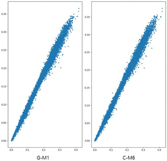 We examined the predictive performance of G-M1 and C-M6. We observed a linear relationship in the scatter plots against actual values (Figure 8). In addition, we observed a similar pattern in the predictions by visualizing the days with intense precipitation, as shown in Figure 9.