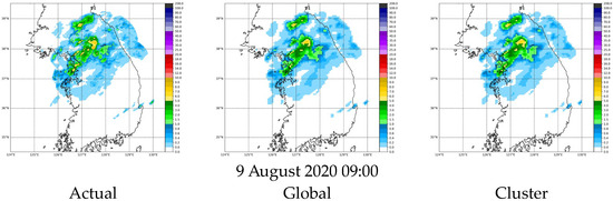 Socioeconomic damage resulting from precipitation occurs mainly in heavy rather than light precipitation cases. Therefore, predictive accuracy for heavy precipitation is crucial. The criterion for heavy precipitation alerts by the Korea Meteorological Administration is 3 h accumulated precipitation of 90 mm or more, equivalent to 5 mm at 10 min intervals. We assessed the predictive performance of the grid cells with actual values exceeding 5 mm for each test dataset. C-M6 demonstrated the best performance with an RMSE of 1.336 and an MAE of 1.133. G-M1, which exhibited the best predictive performance for the entire precipitation dataset, had an RMSE of 1.339 for high-intensity precipitation, which was similar to C-M6 but slightly inferior. In other words, C-M6, which clustered precipitation types, demonstrated the most superior predictive performance for high-intensity precipitation.