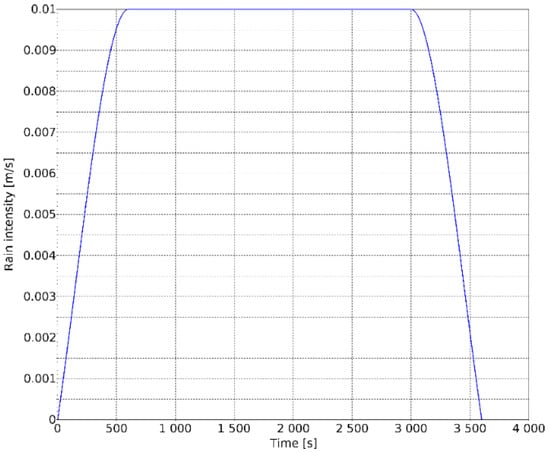 The onset and cessation of rain were assumed to ensure a smooth curve within 5 min. The nodal points were (0;0), (600;0.01), (3000;0.01) and (3600;0). A Hermite spline was applied to these nodal points using the monotone algorithm in Scilab software. This is an open-source numerical algebra system that has been successfully used to solve most mathematical problems related to matrices, numerical methods, etc. []. It ensures that there are no additional oscillations and provides a straight horizontal line if two points have the same ordinate. The resulting spline is smooth.