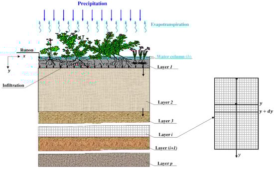 To write the differential equations, an infinitely thin layer of soil or substrate (Figure 2) was identified between the levels and . Rainwater flows from the catchment basin, with area , m2, to the upper surface of the rain garden structure, with an average flow rate , m/s.