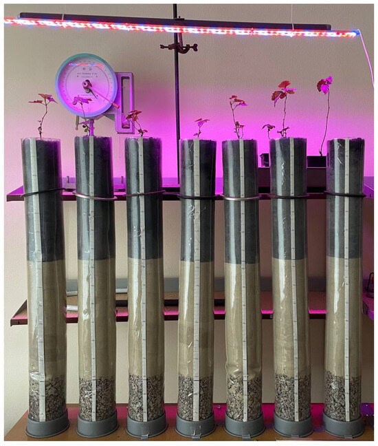 The experimental setup was constructed in the form of cylindrical columns using transparent PVC materials, 100 mm in diameter, to create economical and compact samples with a diameter that would limit the potential edge effect and dispersion in the columns []. Typical rain garden designs typically use a mixture of 10–15% gravel by volume, 50% construction or river sand, 20–30% topsoil, and 20–30% mulch []. The bulk layers in our samples (in the sequence from top to bottom) were as follows: 330 mm of soil, 330 mm of sand, and 180 mm of gravel. Since the main functions of the mulch layer in rain garden designs are to inhibit weed growth, increase the moisture supply to plants, and reduce the risk of waterlogging of the soil environment [], we decided to neglect this layer in the laboratory.