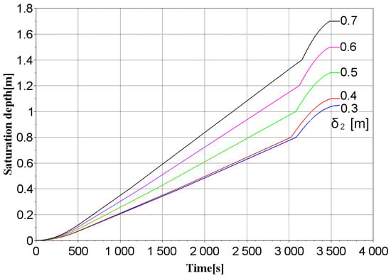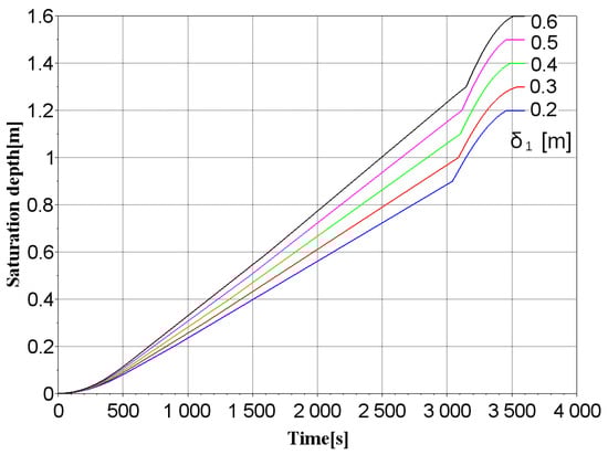 Thus, we obtain the time at which the saturation depth crosses the layer boundary, and then Equation (7) takes the following form: