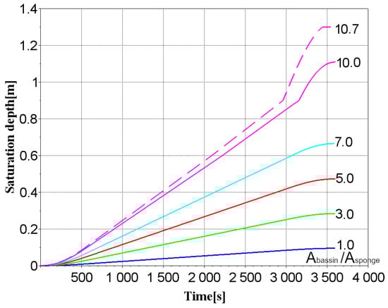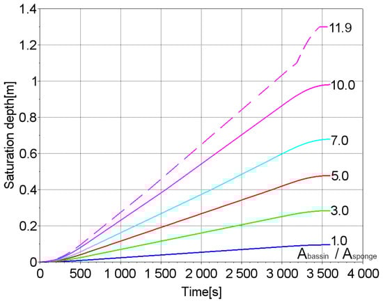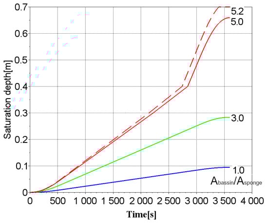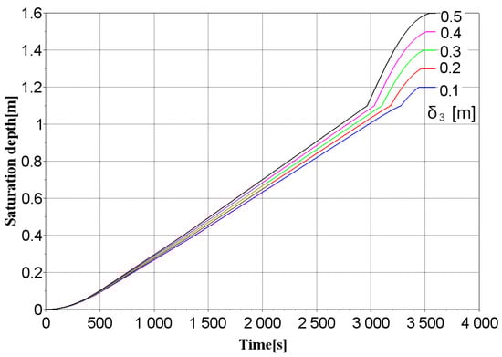 We increased the thickness of the infiltration layer in 10 cm increments. As can be seen from the simulation results, by increasing the value of , it is possible to adjust the optimal values of the area ratio and select the appropriate area of the rain garden structure. For example, for variant 5, with a layer thickness of 0.4/0.7/0.3 m, the complete saturation of the structure occurs within a time of τ = 3487 s (Figure 5). In this case, the size of the structure’s area is 8.2% of the catchment area, which can also be considered an effective indicator, according to the recommendations of [], which suggest a range of 5–10%.