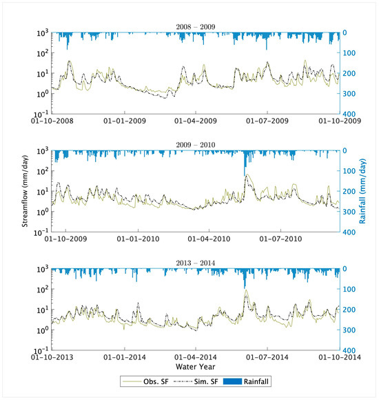 Comparison of observed and simulated discharge for the validation periods: 2008/2009, 2009/2010, and 2013/2014 water cycles (in semi-log scale).