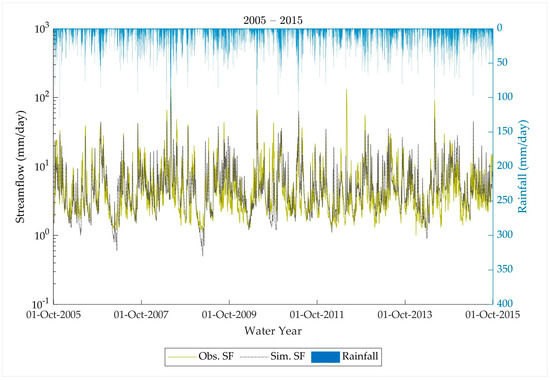 The continuous simulation from October 2005 to September 2015 also indicates that the model can reproduce the low- and high-flow events considerably well, except for the simulated flood event on 2 June 2012, which does not comply with rainfall (Figure 5). It should be noted that the model underestimates the flood peaks since it places more emphasis on capturing low-flow events.