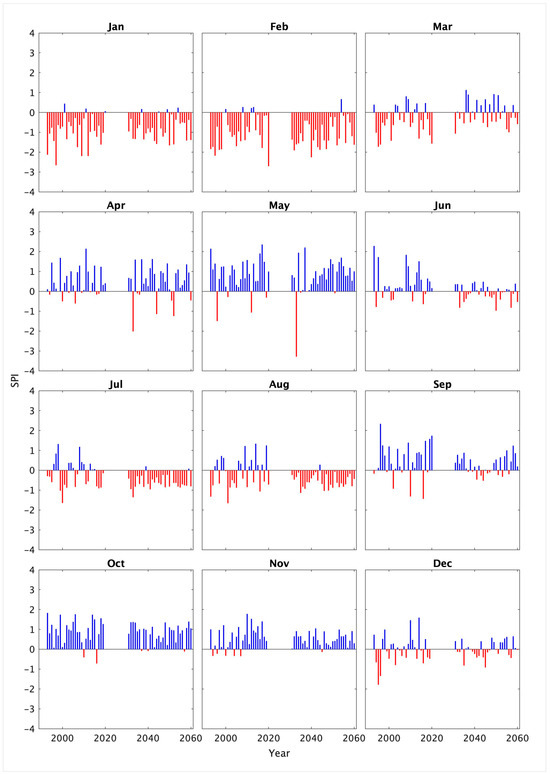 Furthermore, the standard precipitation index (SPI) was used to assess the historical, present, and future precipitation projections. In this study, one-month SPI (i.e., SPI-1) was used as it enables the detection of shorter drought periods within the month, which the longer time scale of SPI may not detect. Also, a longer dry period with less rain followed by a high rainfall event (which is more likely to the situation of the study area) cannot be identified by a longer time scale SPI. The SPI-1 was calculated considering the Thiessen average rainfall of the Millakanda watershed from October 1992 to September 2020 (27 years). The analysis revealed that, under the RCP 2.6 scenario, June, July, and August may become drier towards the end of the design period, while the prevailing dry conditions are projected to continue in January and February (Figure 10). Under RCP 8.5, July and August are likely to become drier towards the end of the design period. Even though September is not a dry month, precipitation may reduce (i.e., SPI-1 values less than one) compared to the baseline period. Further, prevailing dry conditions of January and February are projected to continue, while the month of May would receive more precipitation with high rainfall events (Figure 11). Both scenarios indicate that the first decade of the design period would be drier than the subsequent decades of the design period (i.e., 2040–2060).