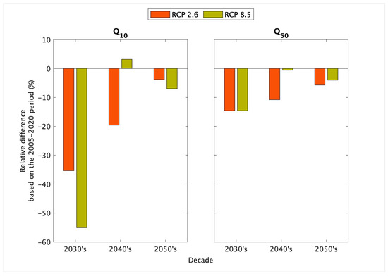 Compared to the baseline conditions (2005–2020), Q10 and Q50 flow values are projected to decrease under both scenarios (Figure 12). The Q10 flow values during the first decadal period of the design period (2030–2040) are projected to decrease by 35% and 55% under RCP 2.6 and RCP 8.5 scenarios, respectively. Under both scenarios, the projected Q50 flows decrease at a lower rate (~15%) than Q10, indicating a more significant reduction in low-flow regimes than the median flow conditions during the 2030–2040 period.