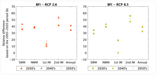 According to the results presented in Figure 14, the projected BFI has increased during all four seasons of the design horizon (i.e., 2030–2060) under both scenarios (compared with the baseline period of 2005–2020), indicating that the base flow component would significantly influence the streamflow of this river basin. The projected BFI shows increments of ~30% to ~45% in the two main monsoons (i.e., SWM and NEM), ~40% to 55% in the 2nd IM and ~20% in the 1st IM season under both scenarios. These increments can be correlated with the decrease in MAM30 (compared to MAM7), possibly due to prolonged dry periods projected (compared to the base period).