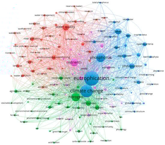 A bibliometric study performed using the Scopus platform and the VOSviewer software, version 1.6.19, yielded 1210 results for “climate change and eutrophication and nutrients or nitrogen or phosphorus” search terms in title/abstract/keywords, starting from 2000 till the present day. The four significant clusters identified by VOSviewer were eutrophication, nitrogen, water quality, and nutrients, as shown in Figure 1.