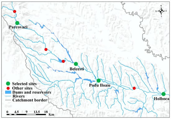 Nowadays, approximately 70% of the Bahlui basin is hydrotechnically managed [26]. No less than 17 reservoirs with different functions, such as flood protection, irrigation, water supply, and fishery, have been built in the river’s basin (Table 3) [21,22].