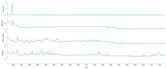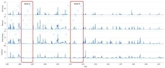 The classic statistical streamflow indicators for the selected locations on the Bahlui River during the 2005–2022 period are presented in Table 4. The daily discharges from 2005 to 2022 for selected locations are presented in Figure 3. Two insets associated with drought periods (2006–2007, Figure 4; and 2011–2013, Figure 5) are marked in Figure 4 and selected for further discussion in Section 3.1.1. A period of heavy rainfalls (May–August 2010, not marked in Figure 3) is also selected to be individually discussed in Section 3.1.2.