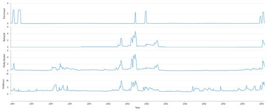 During the first drought period, the annual evolution of mean and median values of the streamflow is consistent, considering the locations’ positions from the source to the river’s end (Table 5, 2006; 2007). The evolution of the median and maximum values is inconsistent with the locations’ positions, highlighting the influence of the Parcovaci and Tansa (Belcesti) reservoirs. The mean and maximum values analysis during the 2011–2013 drought shows that 2012 was the driest year of the period. The second drought period (Figure 5) was also analyzed by other authors, who highlighted that 2012 was a dry year from the hydrological point of view [34].