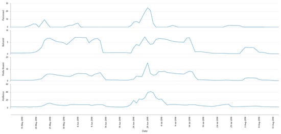 The highest peaks for discharge values were registered on 28–29 July 2010 (Figure 6). These high discharges were preceded by heavy rainfalls on the 24th and 25th of July [36]. Unlike the previous flood intervals at the turn of the century, the urban area of the city of Iasi was protected by Bahlui’s waters.