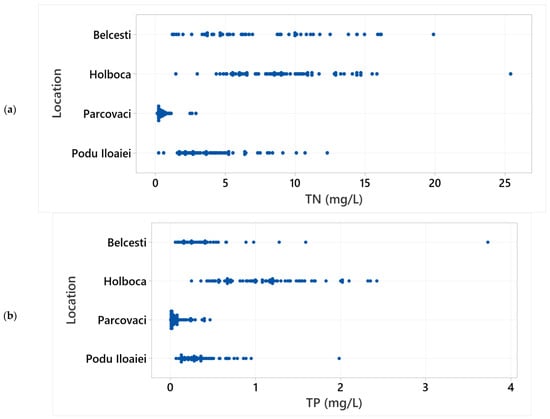 As can be observed from Figure 7, the distribution of individual measurements indicates that the lowest values for both TN and TP are for Parcovaci. On the other hand, the largest domains are obtained for Belcesti and Holboca, where outliers are identified.