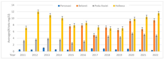 The unexpected high level of TN in the Belcesti area (Figure 8) can be correlated with the uncontrolled use of nitrogen-based fertilizers necessary for agricultural and farming activities. Other authors also observed this aspect [19]. The highest level of TN (except 2018) was reported for the Holboca location during the entire period under study, and it is obviously correlated with the urban area of Iasi.