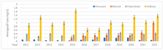 The highest variability is observed for TN in Belcesti, while the lowest is in Parcovaci. On the other hand, for TP, the highest variability is observed in Holboca and the lowest in Parcovaci. Excluding the 2022 reports where the TP average value is atypically high for Belcesti (Figure 9), there is a “normal” trend for this specific indicator: the pristine location exhibits the lowest values, the agricultural and mixed urban/agricultural locations show comparable values (except for in 2018, where the value is higher for the agricultural area), while after the major urban area, the value almost doubles. For the monitored period, the average values of TP (Table 7) are 0.0819 mg/L for Parcovaci and almost 13-fold higher for Holboca (1.0586 mg/L), yet below the NTPA 001/2002 [42] limit of 2 mg/L.