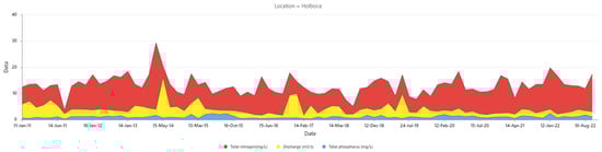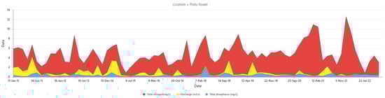 A correlation between the river flow rate, TN, and TP can be observed for Parcovaci between the two discharge peaks in March 2016 and June 2021 (Figure 10). As for the Belcesti site, neither TN nor TP seems to evolve in a visible connection with the river flow oscillations. The nitrogen level is relatively high in this location and exhibits peaks even at low and constant discharge, e.g., April 2019–February 2021, revealing a predisposition to eutrophication that was also reported by other authors [44]. A relatively “normal” correspondence can be seen for Podu Iloaiei in Figure 12, where the TN and TP levels typically increase with the discharge growth, with three exceptions: (i) the period June 2011–July 2013, that overlaps with the drought period (analyzed in Section 3.1.1); (ii) the period September 2018–September 2020, when another prolonged drought period was reported [45], when the TN values are high despite the low river level; and (iii) February 2018, when the TP level is atypically high. The best (visual) correlation can be observed for the last location, Holboca (Figure 13), which is close to the river’s end. There, the discharge levels are higher than in all other locations, being relatively unaltered by the dam’s presence and influenced by the wastewater treatment plant discharge.