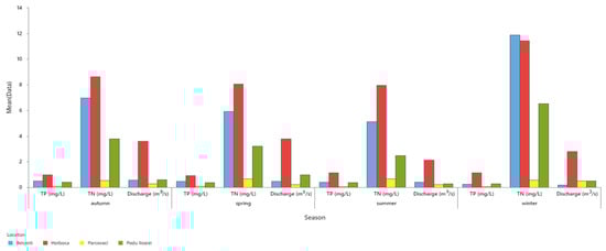 In order to determine if a seasonal variation can be observed for each location, analyzed parameter, and season, the means of the values were computed and are shown in Figure 14. The seasons were identified as follows: winter—December, January, and February; spring—March, April, and May; summer—June, July, and August; autumn—September, October, and November. As observed, TN’s highest concentrations are obtained during the coldest season of the year for all analyzed locations, while the lowest are in the summer. Most probably due to the dam’s presence, no significant seasonal correlations were observed for the other analyzed parameters.