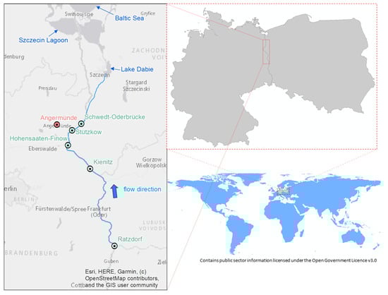 Flow conditions of the Oder River are strongly dependent on wind conditions over the Baltic Sea, as well as the ice cover of Lake Dabie [,]. For this reason, the study area was extended to the mouth of the Oder River near Szczecin (Poland) and into Lake Dabie.