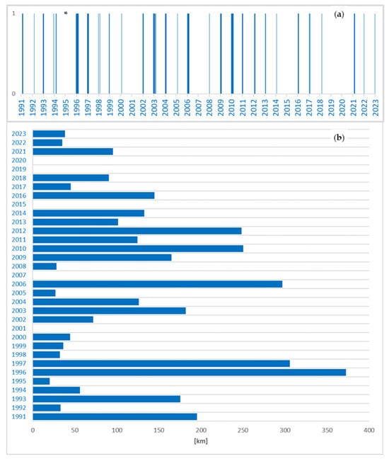 Graphical representation of ice-jam events on the Oder River since 1991. (a) Visualization of the occurrence of consolidated ice cover in the study area (1 = ice cover, 0 = no ice cover, daily temporal resolution; * no data regarding duration in 1995) between 01.01.1991 and 01.01.2023. (b) Maximum extent of ice-jam events. (Sources: RZGW Szczecin, WSA Oder–Havel, IWWN).