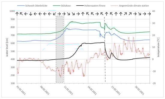Hydrograph of three gauge stations (blue, green and black lines), air temperature (red dotted line) and wind direction (black arrows) during the 2021 ice-jam event. The grey area visualizes the timespan of the ice-jam formation. The grey dashed line indicates the beginning of the ice run observed. (Sources: WSA Oder–Havel).