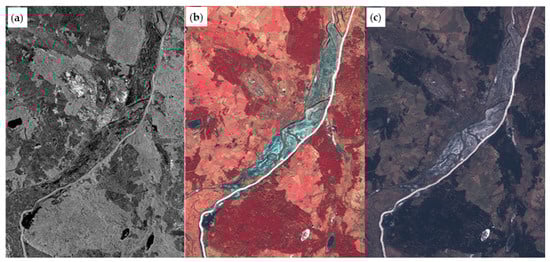 Satellite images of the ice-jam event in the area between Lunow (Poland) and the branch of the West Oder in 2018. (a) Radar satellite image (Sentinel-1, 4th of March), (b) near-infrared enhanced-color image (Sentinel-2) and (c) true-color satellite image (Sentinel-2, 3rd of March).