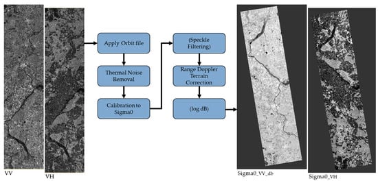 To facilitate a standardized evaluation of the radar imagery and to provide comparability for data obtained at different acquisition specifications (e.g., date, incidence angle and orbit), a set of corrections was applied to the Sentinel-1 images in a preprocessing step (Figure 5). The workflow was derived from the ones described in [,], which also provide further descriptions of the individual steps.