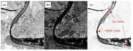 In addition to the processed raster datasets in polarizations, VV and VH, another virtual band was generated, with the aim of increasing the sensitivity towards river ice classification (Figure 6c). This “sensitivity” band was calculated using the following equation: