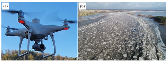 (a) UAV Phantom-4-RTK and (b) UAV image of ice cover on the Oder River in February 2021 near Bielinek (Poland).