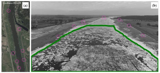 Representation of selected processing steps within the PTV workflow. Pink circles represent ground control points. (a) Orthophoto of the investigation area of the Oder River. (b) Processed UAV image with delineation of the area of interest (green frame).